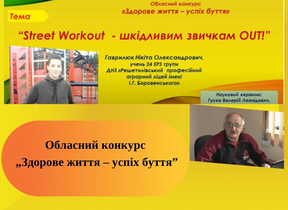 Нікіта Гаврилюк, учень ІІ курсу Решетилівського професійного аграрного ліцею імені І.Г. Боровенського, здобув Диплом ІІІ ступеня в обласному конкурсі Полтавської обласної Малої академії наук учнівської молоді „Здорове життя – успіх буття”. Науковий керівник – Валерій Гусєв, керівник фізичного виховання, нагороджений грамотою Департаменту освіти і науки Полтавської обласної військової адміністрації.