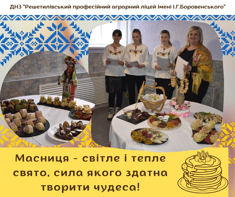 Масниця у народному календарі українців знаменує закінчення зими та початок весни, здавна любиме народне свято зі славними традиціями випікання млинців.Майбутні кухарі, кондитери Решетилівського професійного аграрного ліцею імені І.Г. Боровенського разом із своїми наставниками випікали смачні різноманітні млинці та з душевним теплом частували ними гостей.Серцем обігрій і збережи родину,Богу помолись за нашу Україну! Хай добро усіх рятує, Землі Миру подарує!