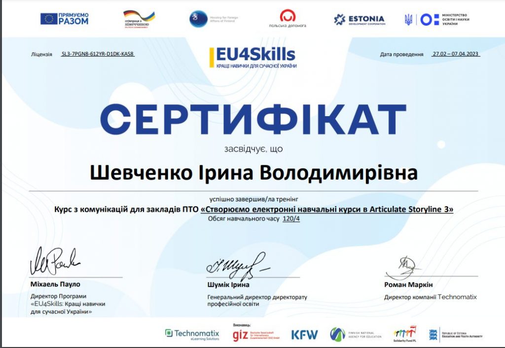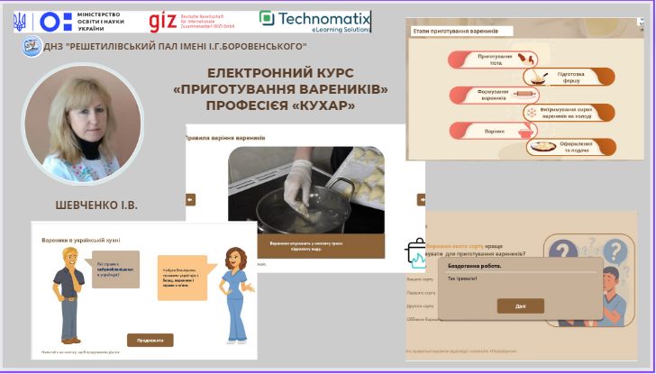 Шевченко Ірина, майстер виробничого навчання Решетилівського професійного аграрного ліцею імені І.Г.Боровенського, ввійшла до числа фіналістів з реалізації всеукраїнського проєкту «Створюємо електронні навчальні курси в Articulate Storyline» та отримала безстрокову ліцензію на використання програми Articulate Storyline 3.24 квітня 2023 року відбулося офіційне онлайн нагородження переможців проєкту «Створюємо електронні навчальні курси в Articulate Storyline», який тривав з 27 лютого до 07 квітня.Проєкт здійснювався за підтримки Німецького товариства міжнародного співробітництва (GIZ), в рамках програми «EU4Skills: Кращі навички для сучасної України» за сприяння Міністерства освіти і науки України. Мета – створення власних електронних освітніх матеріалів та розміщення їх на вебплатформі дистанційного навчання «Професійна освіта онлайн».Навчання здійснювала кваліфікована тренерська команда групи компаній Technomatix – лідера зі створення e-learning рішень в Україні.У рамках проєкту Ірина Володимирівна створила авторський навчальний електронний курс «Приготування вареників» (професія «Кухар»), який за результатами фінального оцінювання увійшов до 15 робіт з найвищими бали за усіма критеріями з трьох етапів розробки курсу: педагогічного, графічного дизайнів та верстки. Електронний курс буде розміщений на вебплатформі «Професійна освіта онлайн».Щиро вітаємо нашу колегу із вагомим професійним здобутком! Бажаємо завжди впевнено йти до своєї мети та примножувати нові досягнення на шляху модернізації професійної освіти!