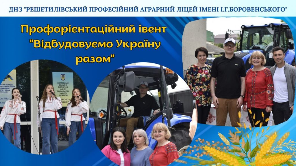 27 травня Решетилівський професійний аграрний ліцей імені І.Г.Боровенського взяв участь у профорієнтаційному івенті «Відбудовуємо Україну разом».Проблема вибору професії завжди була актуальною і залишається такою в сучасних умовах.Запрошуємо на навчання випускників освітніх закладів області у наш ліцей, який має висококваліфікований педагогічний колектив, потужну матеріально-технічну базу, комфортні умови проживання в учнівському гуртожитку та сучасний спортивний комплекс для занять спортом.Робітнича професія – твоє успішне майбутнє!