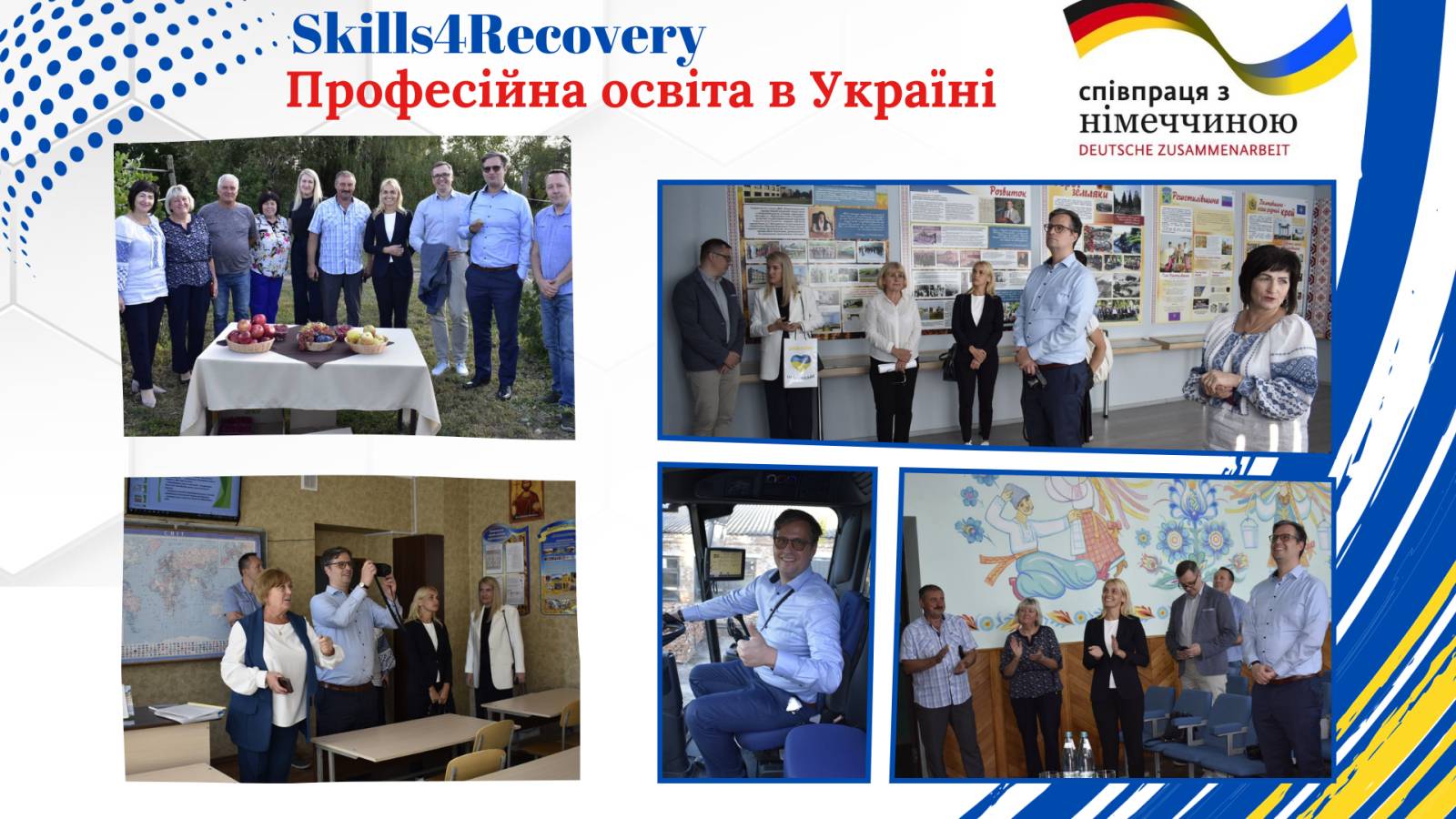 Колектив Решетилівського професійного аграрного ліцею зустрічав представників проєкту «Професійна освіта в Україні/Skills4Recovery», мета якого – збільшення потенціалу кваліфікованої робочої сили для відновлення України. Проєкт реалізується Німецьким товариством міжнародного співробітництва за дорученням Федерального міністерства економічного співробітництва та розвитку Німеччини у партнерстві з Міністерством економіки України та Міністерством освіти і науки України.Директор ліцею Ніла СПІЛЬНА стала спікером під час модерованої дискусії у рамках презентації проєкту та презентувала досвід роботи освітнього закладу з підтримки вразливих верств населення, курсової підготовки незайнятого населення та перепідготовки працюючого населення на підставі ваучерів.Керівник проєкту Міхаель Пауло разом з представниками проєкту відвідали ліцей, зустрілися з членами колективу, оглянули матеріально-технічну базу освітнього закладу.Сподіваємося, що співпраця з міжнародними партнерами дасть плідні результати.