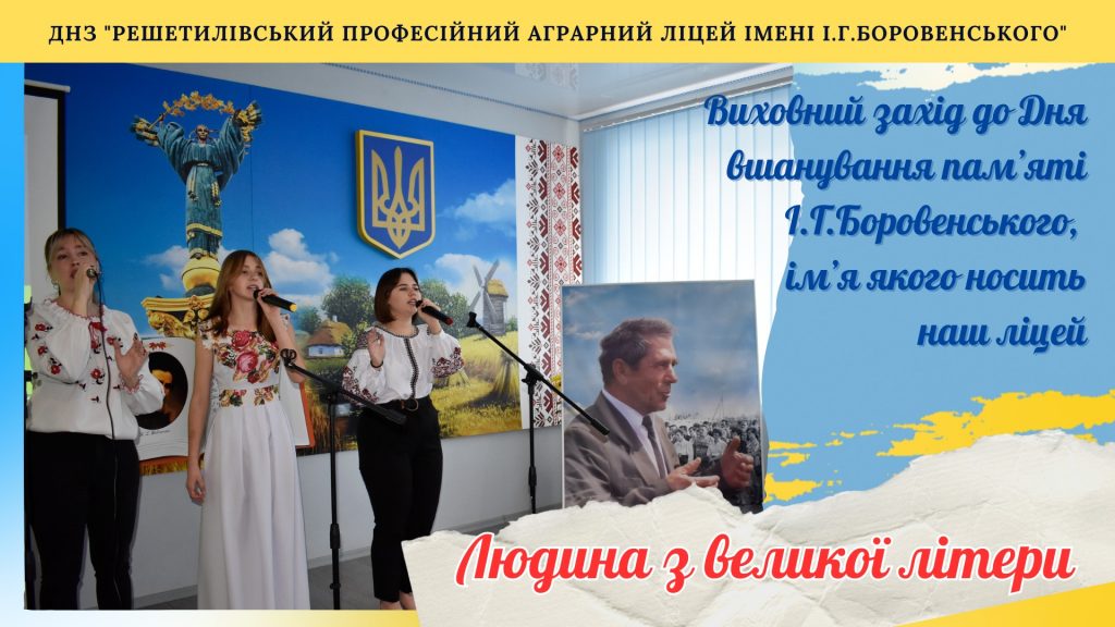 Учнівський та трудовий колектив Решетилівського професійного аграрного ліцею імені І.Г.Боровенського вшанував пам’ять Івана Григоровича Боровенського, ім’я якого носить наш ліцей. За його ініціативою, наполегливістю та невтомною працею було створено наш освітній заклад.І.Г.Боровенський – Людина з великої літери, це особистість, яка надихала інших людей, ділячись своєю любов’ю до життя. Іван Григорович прожив яскраве життя, наповнене натхненною працею і щоденними турботами про людей. Його життя – як факел, взірець для нас усіх.