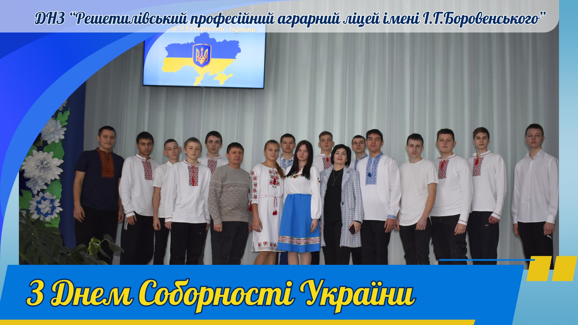 Сьогодні у Решетилівському професійному аграрному ліцеї імені І.Г.Боровенського відбувся урочистий захід, присвячений Дню Соборності України – святу, яке нагадує нам про важливість єдності нашої країни.Захід підготував і провів захисник України, учасник бойових дій, педагог нашого ліцею Жук Станіслав Петрович. Його особистий внесок у захист Батьківщини та активна громадянська позиція надихнули всіх учасників заходу та стали яскравим прикладом справжнього патріотизму.Під час заходу згадали історичні події 22 січня 1919 року, коли був проголошений Акт Злуки Української Народної Республіки та Західноукраїнської Народної Республіки. Цей день є символом єдності українського народу та нашої спільної боротьби за свободу і незалежність.Програма свята була насиченою та зворушливою. Учні декламували патріотичні вірші, співали пісні про Україну. Цей захід став щирим нагадуванням що сила нашої країни – в єдності, патріотизмі та любові до рідної землі.Слава Україні!