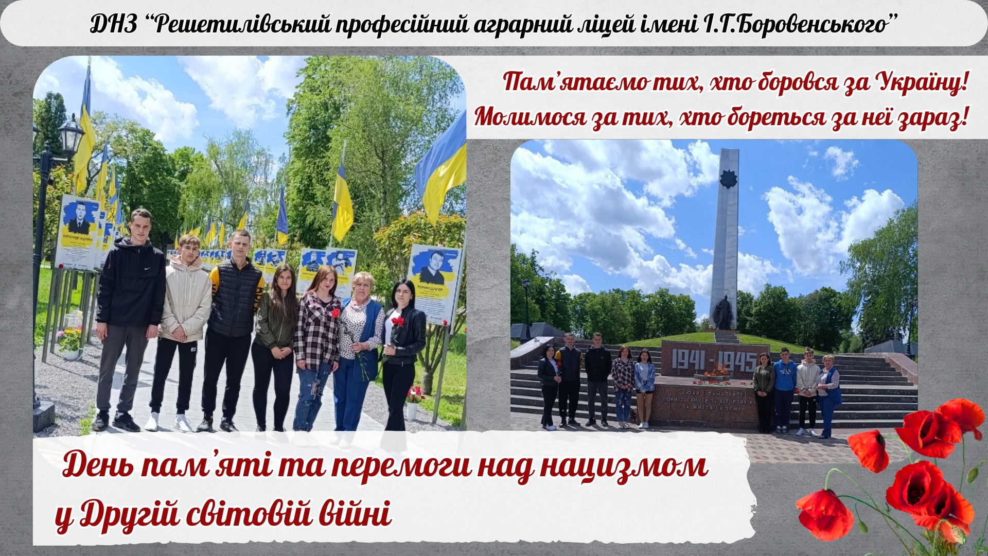 Сьогодні, 8 травня, ми вшановуємо пам’ять усіх жертв Другої світової війни. Низько схиляємо голови перед усіма, хто боровся за мир, хто віддав своє життя у цій страшній війні. Їхній подвиг ніколи не буде забутий.З особливим болем згадуємо і наших сучасних Героїв, які віддали своє життя, захищаючи Україну від російської агресії. Їхня мужність і самопожертва є продовженням боротьби за свободу та незалежність нашої землі.З гордістю сьогодні ми згадуємо наших захисників України, які зі зброєю в руках дають відсіч російському агресору. Їхня мужність, стійкість та самопожертва є прикладом незламного духу нашої нації. Слава кожному воїну, який боронить нашу землю! Їхній подвиг наближає нашу Перемогу.Пам’ять про героїчне минуле та сьогодення надихає нас з вірою дивитися у вільне та мирне майбутнє України.