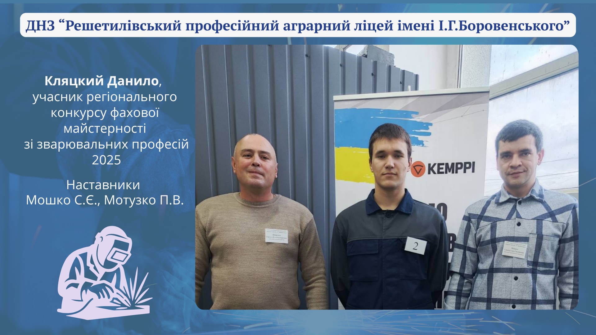Кляцкий Данило, учень Решетилівського професійного аграрного ліцею імені І.Г. Боровенського за професією «Електрозварник ручного зварювання», взяв участь у регіональному конкурсі фахової майстерності серед здобувачів освіти Полтавщини зі зварювальних професій. Захід відбувся 29 жовтня на базі Вищого професійного училища №7 м. Кременчука. Це справжнє змагання геніїв зварювання та приборкувачів електродів — представників найкращих закладів професійної освіти області! Участь у конкурсі стала чудовою нагодою перевірити знання, випробувати себе у практичних завданнях, відчути командну підтримку і зробити крок уперед у професійному зростанні. Дякуємо педагогам — майстру виробничого навчання Мошку Станіславу Євгеновичу та викладачу Мотузку Павлу Володимировичу — за професійну підготовку, наставництво й підтримку нашого учня.Ми цінуємо старання, наполегливість і любов до справи кожного, хто творить свій шлях у професії!
