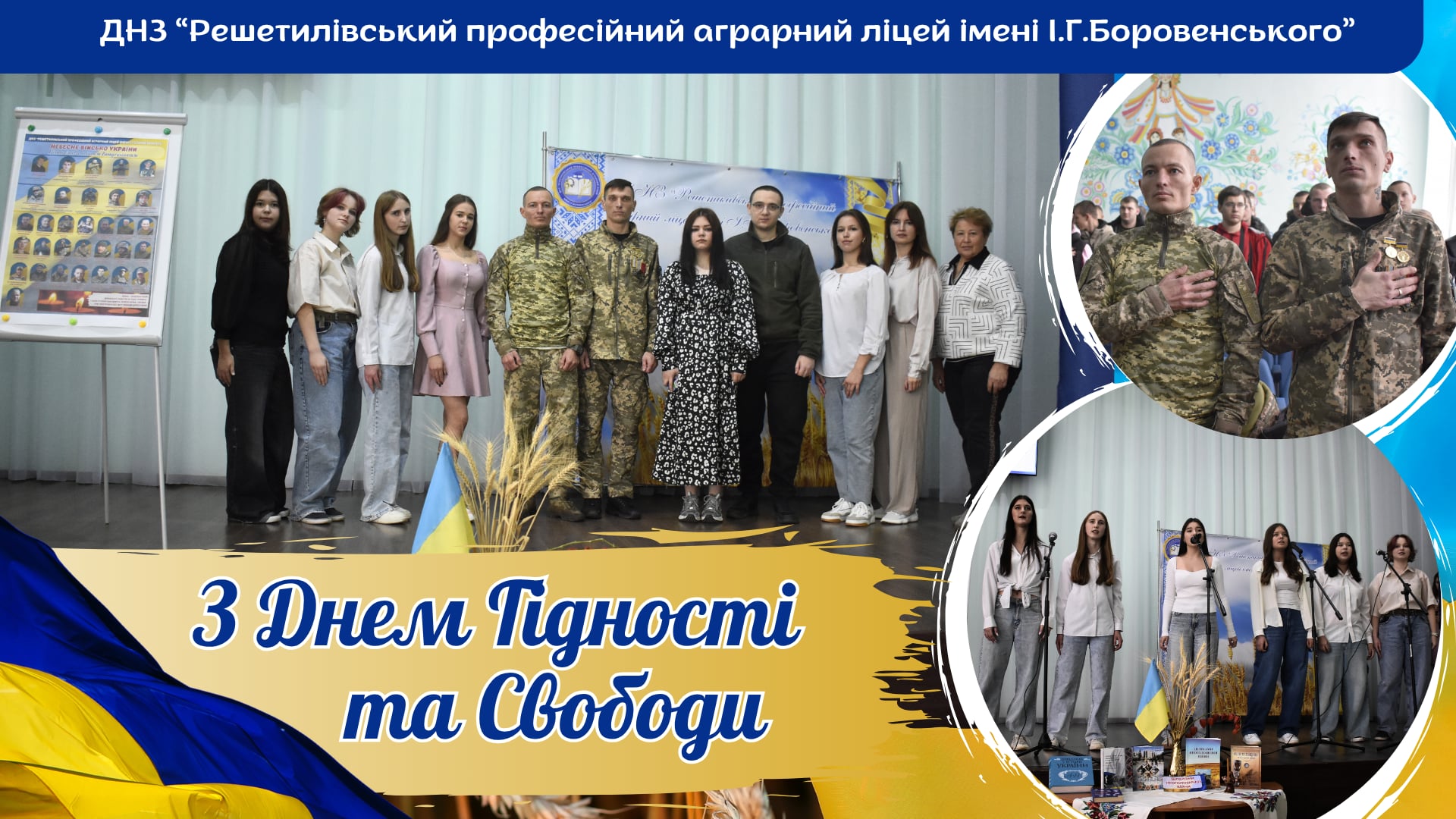 Свобода має свою ціну, і ми це пам’ятаємоУ Решетилівському професійному аграрному ліцеї імені І.Г.Боровенського відбувся важливий виховний захід, приурочений до Дня Гідності та Свободи.Ми вшановуємо мужність та патріотизм тих, хто восени 2004 року (Помаранчева Революція) та у листопаді 2013 – лютому 2014 років (Революція Гідності) став на захист демократичних цінностей України. Це — доленосні події, які сформували нас як націю. Схиляємо голови перед світлою пам’яттю Героїв Небесної Сотні та усіх, кого було вбито за право жити у вільній країні. Історія тих днів нерозривно переплітається із сучасною боротьбою за незалежність України. Особливою та зворушливою частиною заходу стала зустріч із нашими випускниками, які стали на захист України молодшим сержантом Піциком Артемом Володимирович та солдатом Руденко Ігорем В’ячеславовичем.Їхні щирі та емоційні розповіді про власний шлях і службу торкнулися сердець учнів, стали живим свідченням незламності українського народу.”Є нація! Хай знають всі у світі. Ми є! Народ піднявся із колін…” – ці слова стали акцентом нашого заходу.