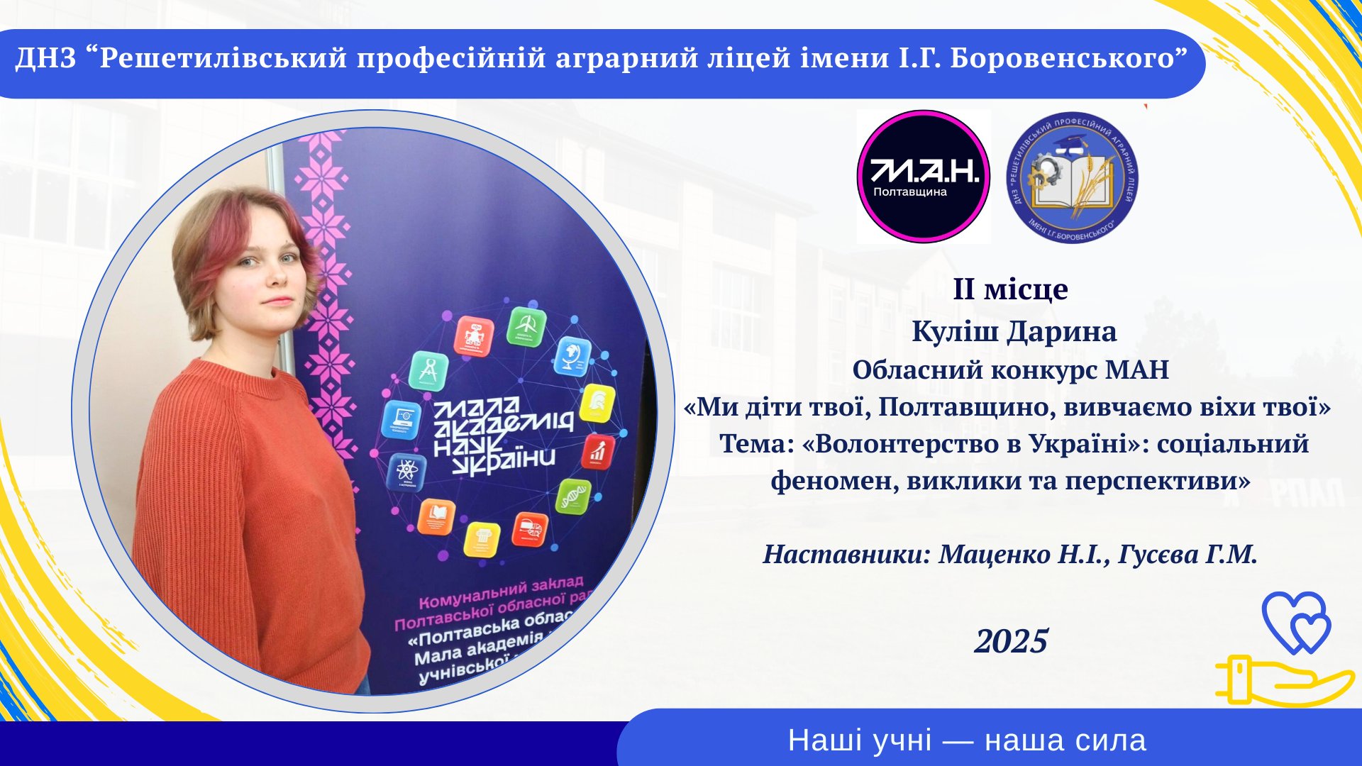 Ми пишаємось нашою дослідницею!20 листопада 2025 року Куліш Дарина Миколаївна, учениця І курсу Решетилівського професійного аграрного ліцею імені І.Г.Боровенського здобула ІІ місце у обласному конкурсі «Ми діти твої, Полтавщино, вивчаємо віхи твої» (МАН).Дарина представила глибоке й суспільно важливе дослідження — «Волонтерство в Україні: соціальний феномен, виклики та перспективи», в якому проаналізувала розвиток волонтерського руху, зокрема в Решетилівській громаді, та показала, наскільки потужною є сила єдності українців. Дослідження Дарини — це не просто наукова робота. Це голос молодого покоління, яке робить свій внесок у Перемогу та формує майбутнє України. Це приклад того, що волонтерство — не обов’язок, а поклик серця і прояв громадянської зрілості.Висловлюємо подяку науковим керівникам: Маценко Н. І. та Гусєвій Г. М. за підтримку, наставництво і формування дослідницької культури молоді.Дарина, твій результат — це наша гордість!